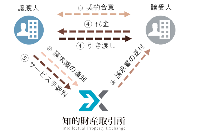 - 譲渡代金、ロイヤリティ、その他の取引代金の請求書の作成・送付は知的財産取引所(株)が行い、取引当事者間での直接の請求書の送付は行わないものとします。